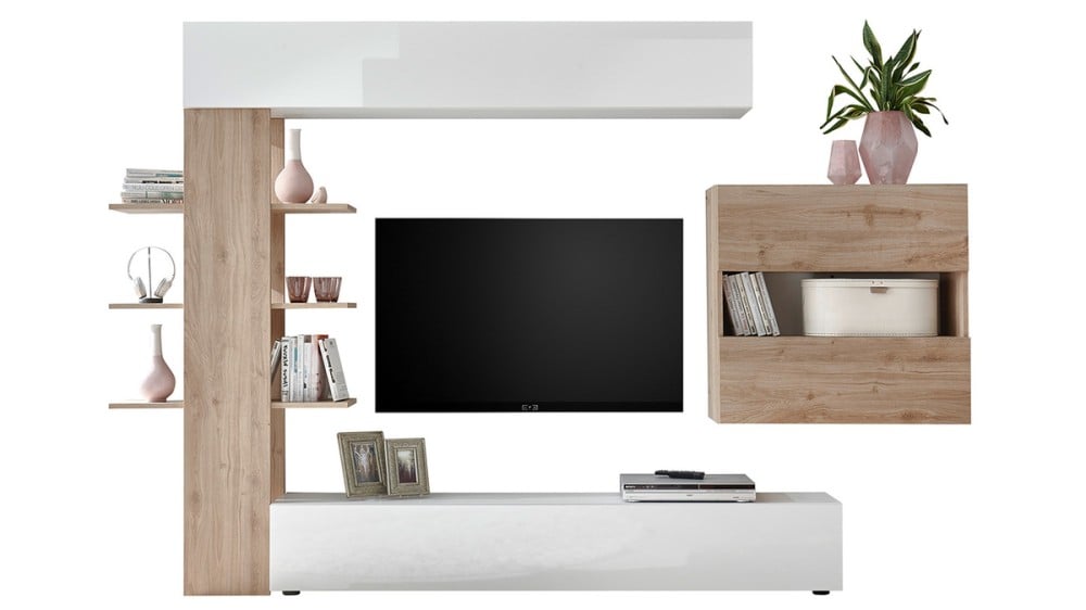 بفضل التركيبة الكاملة لجدار ، تأخذ مساحة التلفزيون بُعدًا جديدًا تمامًا! وهي مكونة من أربعة عناصر مستقلة . تتيح لك هذه المجموعة إنشاء مساحة تخزين مصممة وعملية في غرفة المعيشة. يوفر العنصران الأفقيان ، المجهزان بمكانين للتخزين، سطحًا جميلاً لتنظيم المتعلقات في غرفة المعيشة الخاصة بك. يتم استكمالها بوحدة رأسية جميلة تتضمن ثلاثة أرفف كبيرة وعنصرًا يتكون من مكان مفتوح ومساحة تخزين مغلقة.